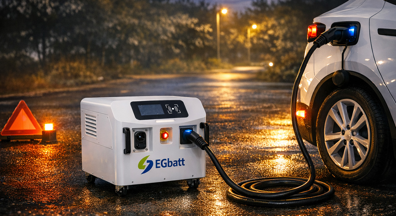 The EGbatt Portable 11kW DC Fast Charger (Built‑in Battery, Off‑Grid Ready). When an EV runs out of charge on a highway or remote road, tow trucks equipped with this 11kW off‑grid charger can deliver a life‑saving 10–15 minute boost. The built‑in 11.264kWh battery provides 5–8 kWh of usable energy – enough to add 30–50 km of range, allowing the driver to reach the nearest public charger. No grid access, no generator noise, and no waiting for a flatbed tow.